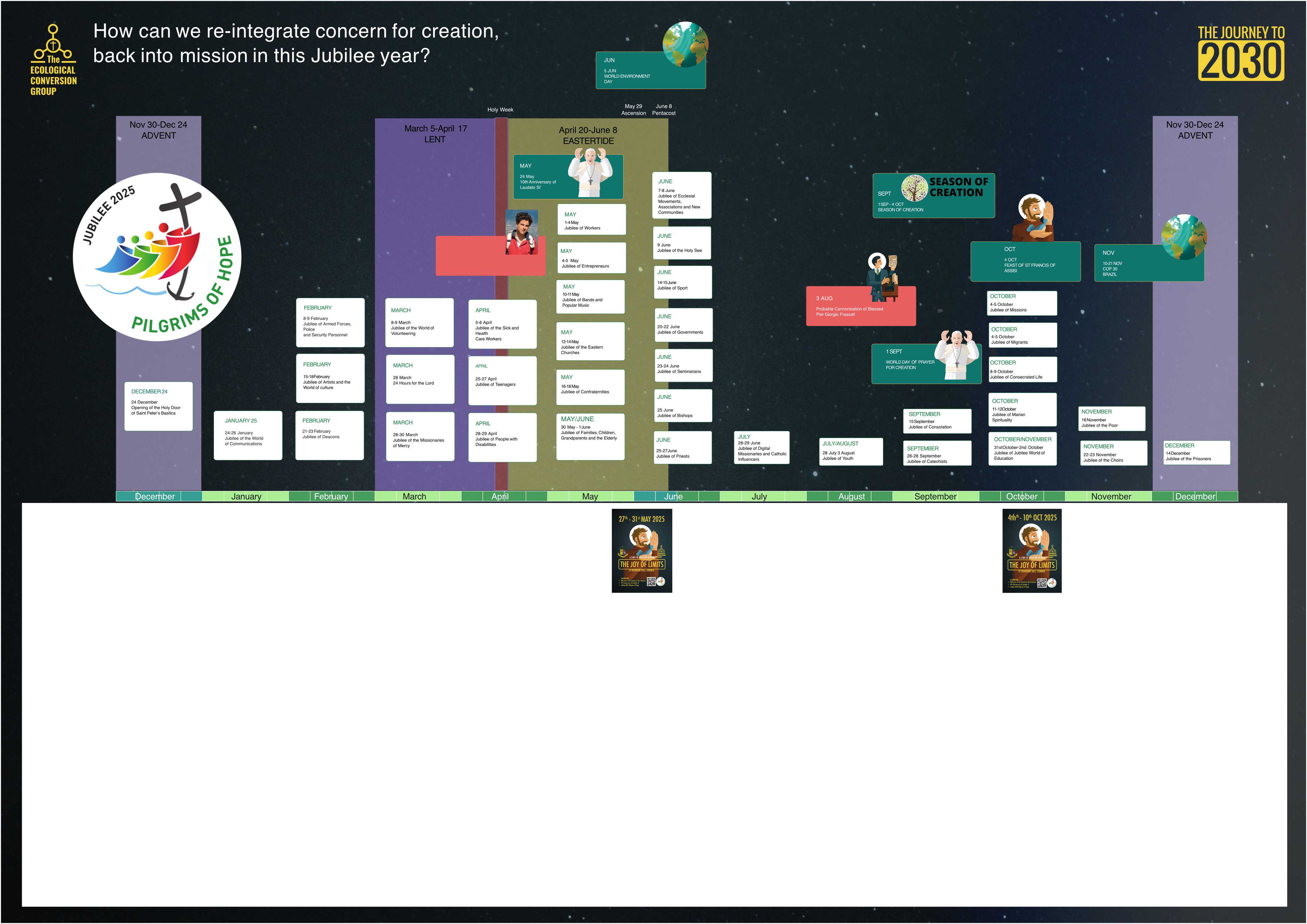 A printable calendar for 2025 showing Jubilee celebrations, canonisations, and other key Care of Creation dates.